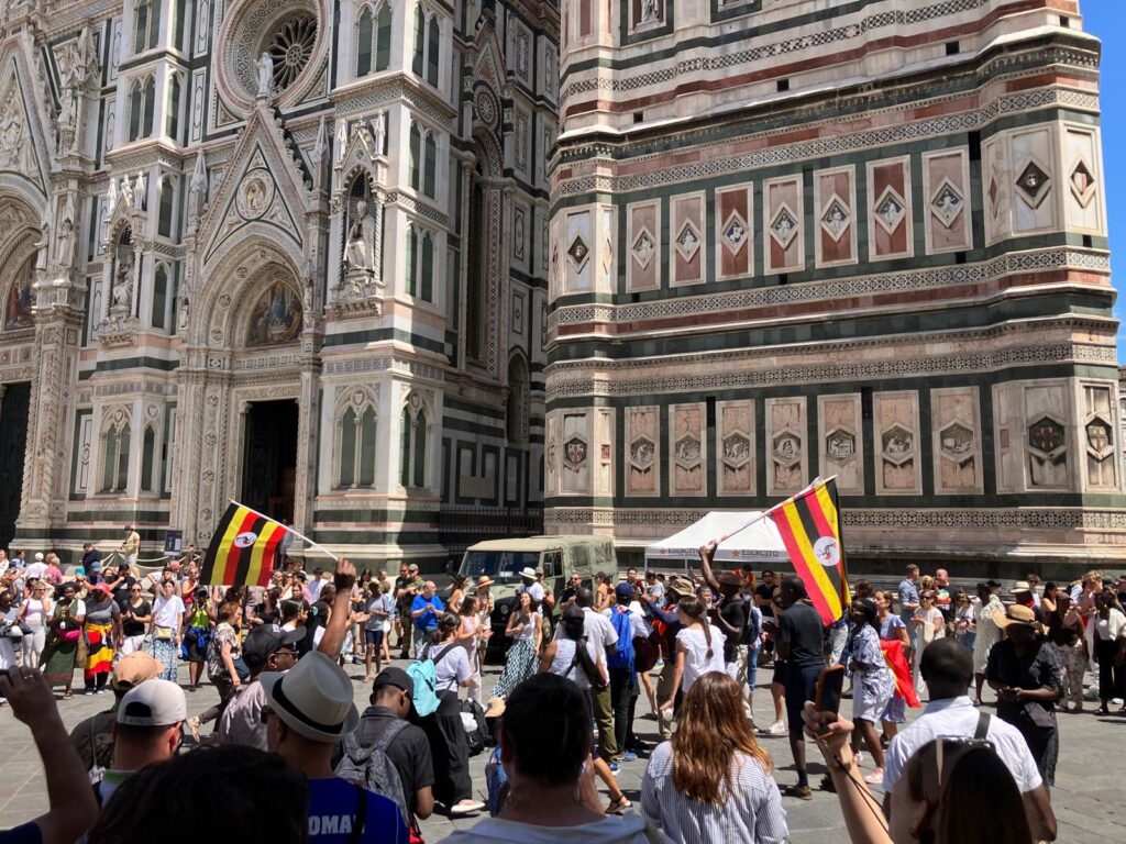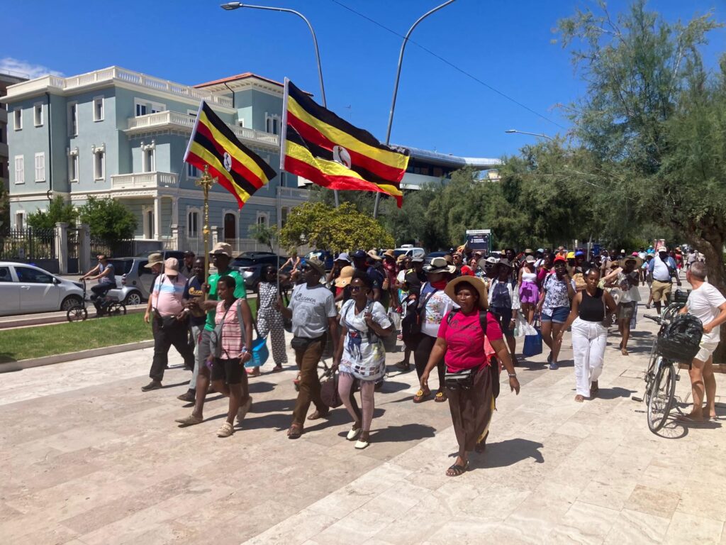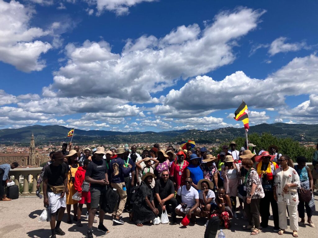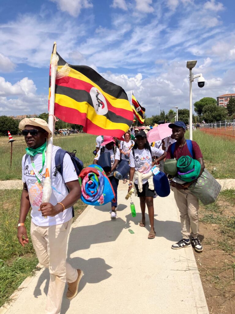 Midway through the pilgrimage, the Ugandan group carried the announcement of the Gospel into the streets. In Bologna’s main square they proclaimed the Good News to all, and in Florence they joined thousands of young people from around the world in music, dance, and joyful witness to Christ. Along the way, they visited many important cities, including Pescara and Porto San Giorgio, before arriving in Rome, the heart of the Church.